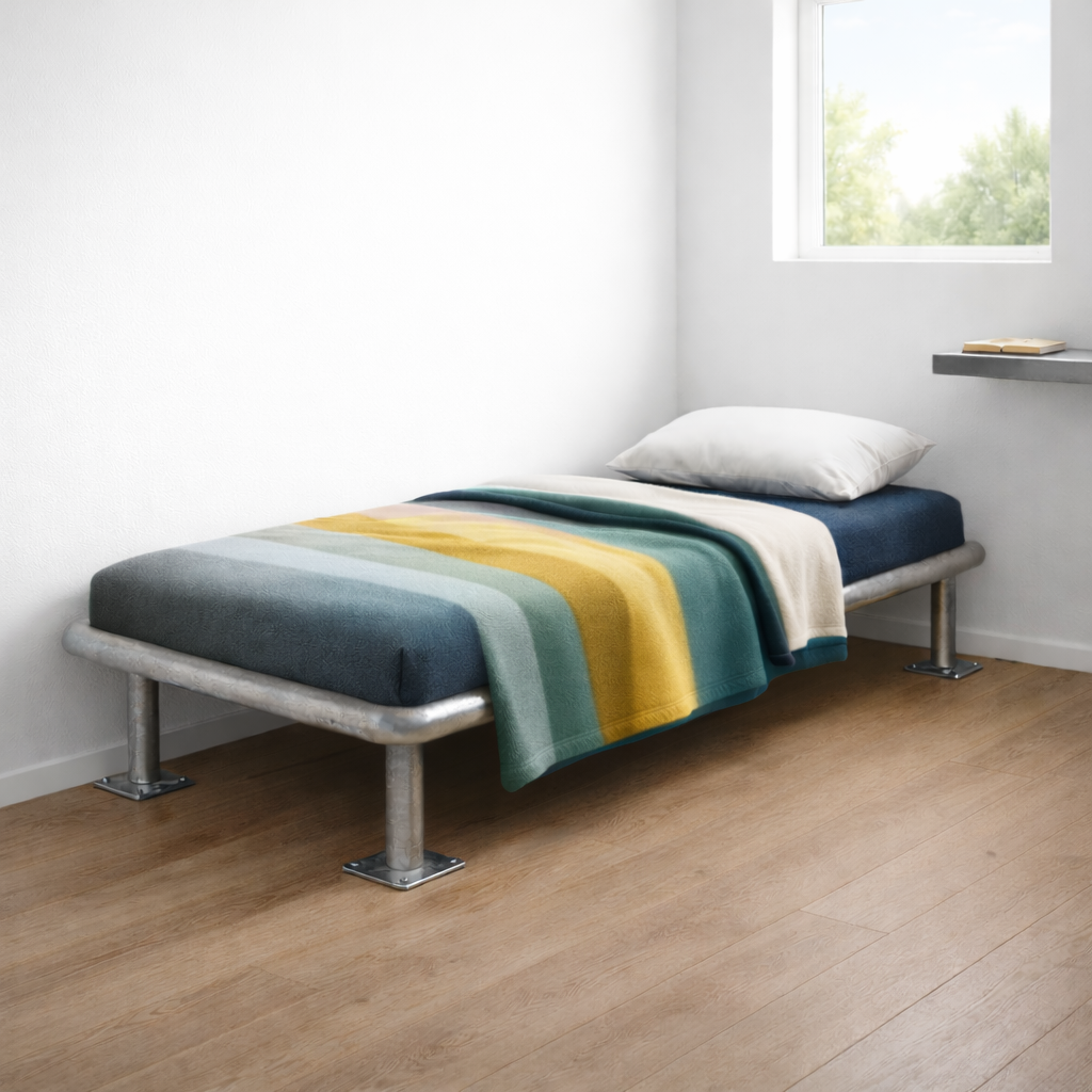 Le lit en inox Rokmob® présente une durabilité optimale dans les environnements ultra-exigeants ( troubles du comportement, fluides corporels, chocs, vandalisme).